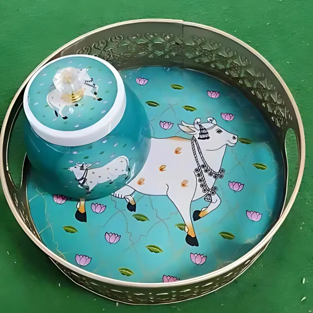 Pichwai Gold Plated Serving Tray with Cow & Lotus Jar